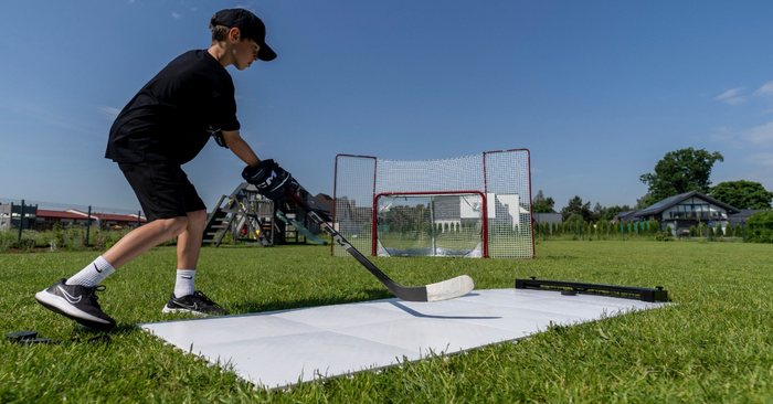 Ung kille tränar passningar med hockeyklubba och puck på Extreme Hockey Flooring Tiles Passing Kit, perfekt för skottramp och hockeymål.